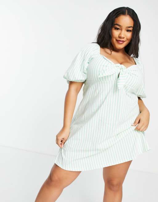 Asos Design Curve Bow Front Mini Dress In Green And White Stripe Asos